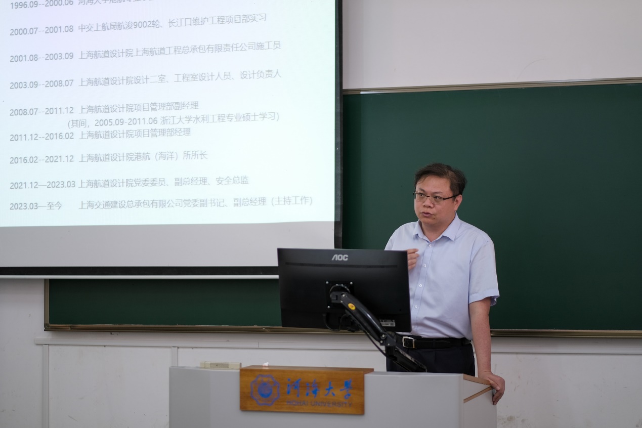 2023年6月12日,中交上航局上海交通建设总承包有限公司党委副书记、副总经理(主持工作)孙鹏为2022级港航4班带来题为“我的‘前半生’”的生涯分享。2022级港航4班全体学生参加活动,班导师陶爱峰教授出席并主持。