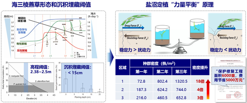 (3)研发了基于“力量平衡”原理的盐沼生态修复技术,提升土著盐沼种群密度3倍以上;创新了基于“机会窗口”研判的盐沼适宜性生境选择技术,盐沼幼苗存活率提升至60%,构建了盐沼长效保护修复技术模式,累计修复盐沼湿地面积近1万亩,节省成本超1亿元(图3)。