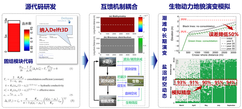 (2)厘清了盐沼定植扩散完整生活史的关键生态过程,识别了影响盐沼幼苗定植扩散的主控因子;研发了耦合植被动力地貌互馈机制的数值模型,降低滩涂中长期演变模拟误差,提升了盐沼时空动态模拟精度(图2);提出了基于输沙率及其梯度为判据的四种地貌平衡态类型,发展了地貌平衡态理论。