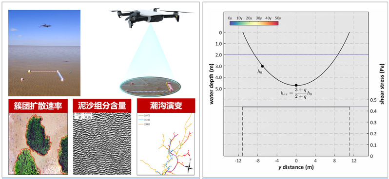 (1)创新了基于遥感含水量的滩涂地形反演技术,百公里级大范围地形监测精度优于20cm;突破了滩涂盐沼前缘地形、潮沟宽深、簇团半径等多参数的厘米级无人机观测技术瓶颈,首次解析了潮沟基于幂次关系的稳定形态(图1);研发了滩涂自动升降观测系统与同步观测阵列,攻克了植被影响下滩涂水沙动力参数同步获取难题。