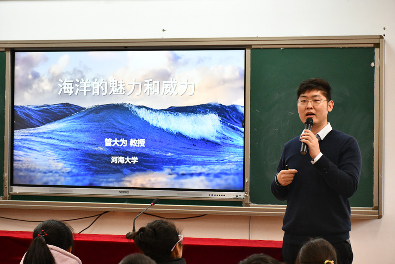 随后,张书记一行赴庆安镇中心小学,开展科普进校园活动。学院副院长张继生教授和能源所、装备所党支部书记薛米安教授分别向大家介绍了学院及党支部的基本情况。支部党员管大为教授用通俗易懂的语言,结合生动的实例,为中心小学三年级的同学作了一场题为《大海的魅力和威力》的科普知识讲座,系统介绍了大海的奥秘与各种海洋灾害,让同学们对海洋有了更深入的了解和认识。