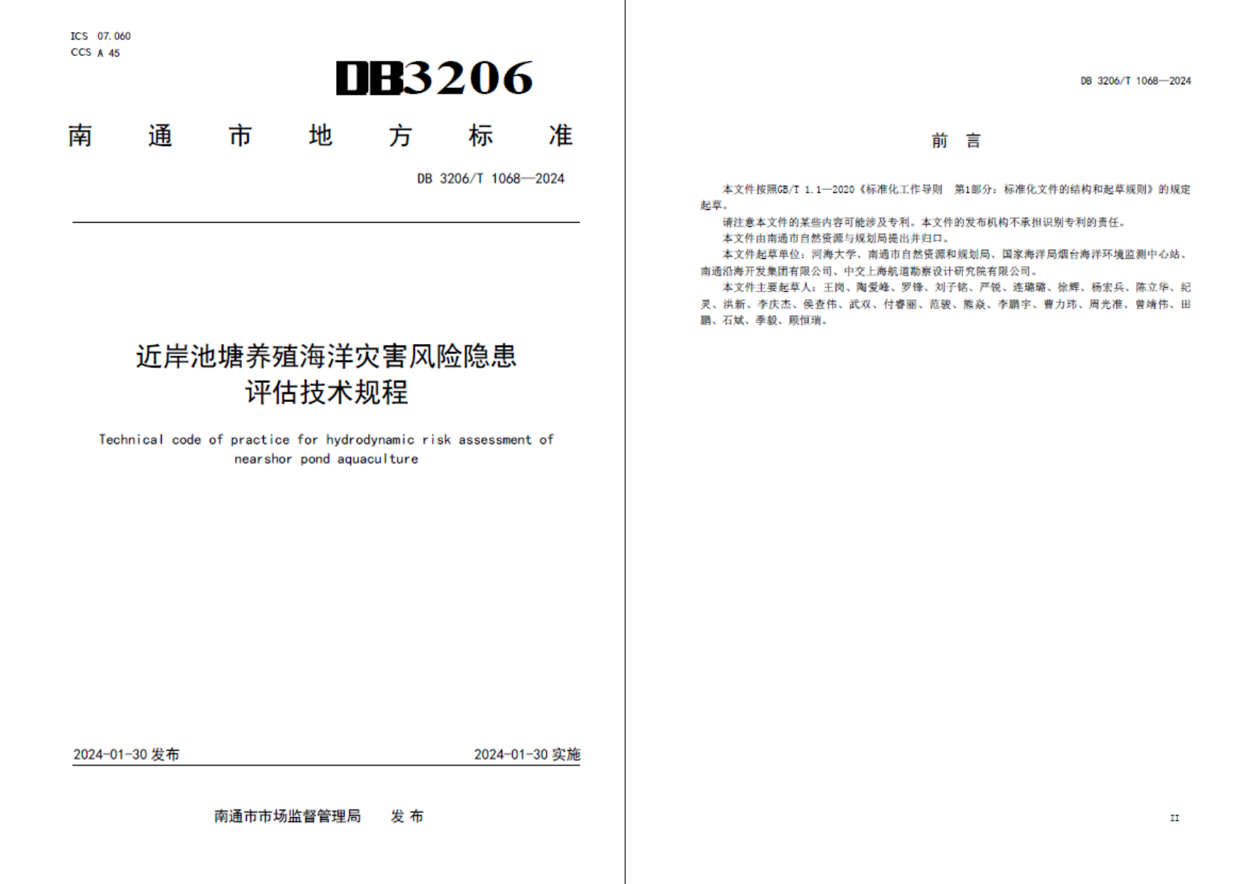 近日,欧洲足球赛程 教师主编的地方标准《近岸池塘养殖海洋灾害风险隐患评估技术规程》(DB3206/T 1068-2024)《滩涂贝类养殖海洋灾害风险隐患评估技术规程》(DB3206/T 1067-2024)正式发布(南通市地方标准发布公告2024年第1号(总第25号)),于2024年1月30日起实施。该标准由南通市自然资源和规划局归口管理。参与标准编制的欧洲足球赛程 老师有王岗、陶爱峰、罗锋、付睿丽、范俊、熊炎等。
