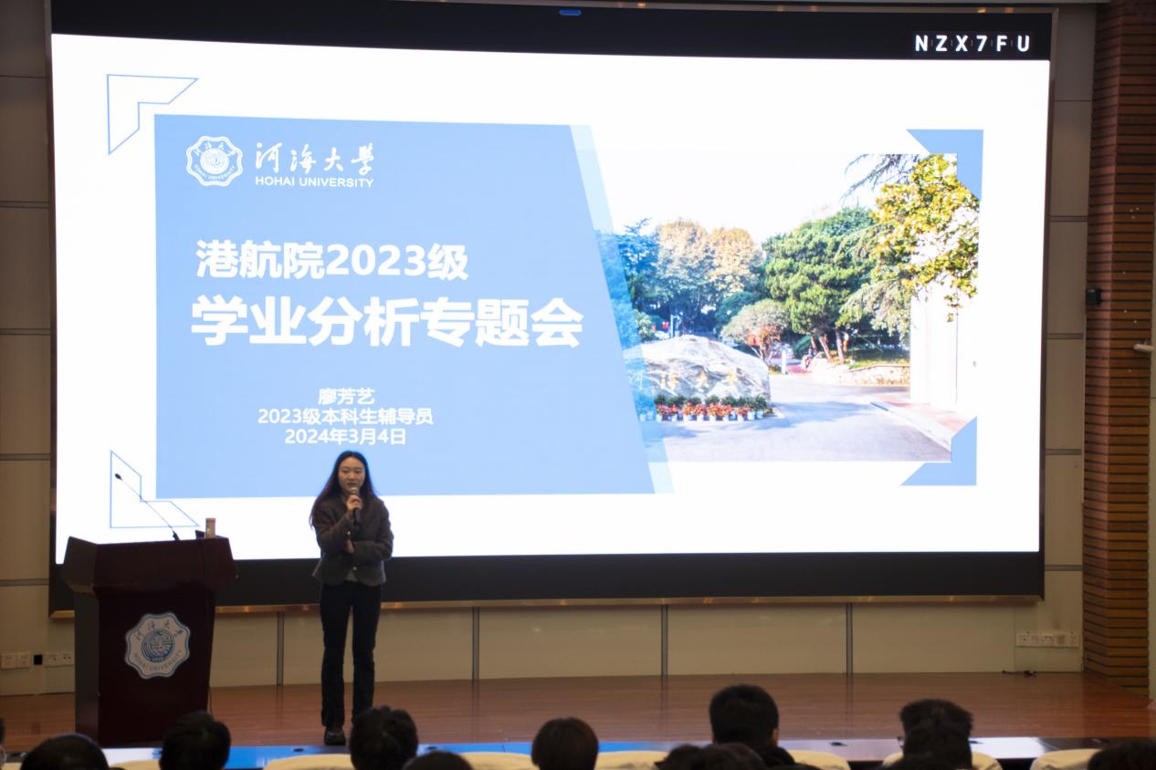 2024年3月4日下午,港航院2023级在江宁会议中心举行年级大会,大会由辅导员廖芳艺老师主持,2023级全体学生参加本次大会。辅导员廖芳艺就大一上学年学业整体情况、学情分析以及近期开展的志愿服务活动、主题教育月进行汇报。