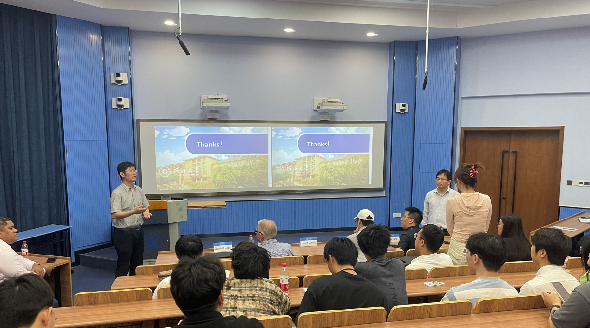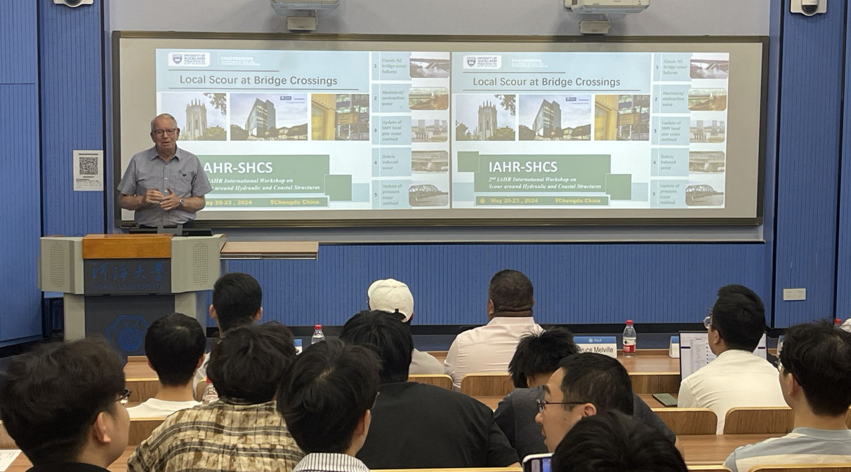 Bruce Melville院士以“Local scour at bridge crossings”为题作了报告,并详细讲解了近40年来新西兰因洪涝导致的重大桥梁冲刷破坏事件以及相关桥墩基础冲刷预测方法。Kilisimasi Latu高级讲师以“Design and application of living roofs”为题报告了生态屋顶的设计理论与应用。唐子豪博士分享了他在奥克兰大学的读博经历与生活状态。随后,管大为副院长为大家详细介绍了我校与奥克兰大学的合作历史,以及欧洲足球赛程 -奥克兰大学双博士、双硕士项目的具体内容与申请条件。