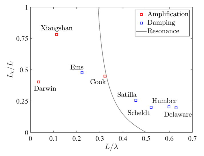 研究结果表明,潮间带通过滩槽之间的宽度比和水通量比(分别代表潮滩蓄水效应和潮滩动量传递效应)增大潮波波数。在较深、较短或摩阻较弱的河口,潮波波数较小且低于河口共振阈值,潮间带引起的波数增大使得河口系统更加接近共振状态,从而引起潮波振幅放大。而在较浅、较长或摩阻较强的河口,潮波波数较大且超过河口共振阈值,潮间带引起的波数增大促使河口系统进一步偏离共振状态,从而引起潮波振幅减小(图2)。本研究从机理层面系统揭示了潮间带对河口潮波动力过程的调控作用,为制定减缓河口洪水与侵蚀等灾害风险的有效策略提供了关键科学依据。