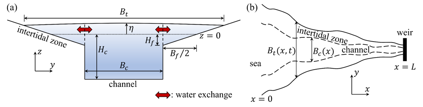 潮滩是河口的重要生态系统,在改善水质、调节气候变化以及提供海岸防护等方面发挥着关键作用。然而,受人类活动和气候变化等多重因素的共同影响,全球潮滩面积正持续快速缩减。这一变化不仅显著改变了河口的动力过程,也对河口生态环境构成了严重威胁。尽管如此,河口中潮滩与深槽之间的动力互馈机制仍缺乏系统认识,这显著限制了我们对当前及未来人类活动与气候变化影响的有效评估与预测。为此,本研究构建了一个覆盖潮间带-深槽体系的一维潮波解析模型,可分离并定量解析控制河口潮波传播的关键物理过程,从而揭示潮滩与深槽水体之间的相互作用机理(图1)。